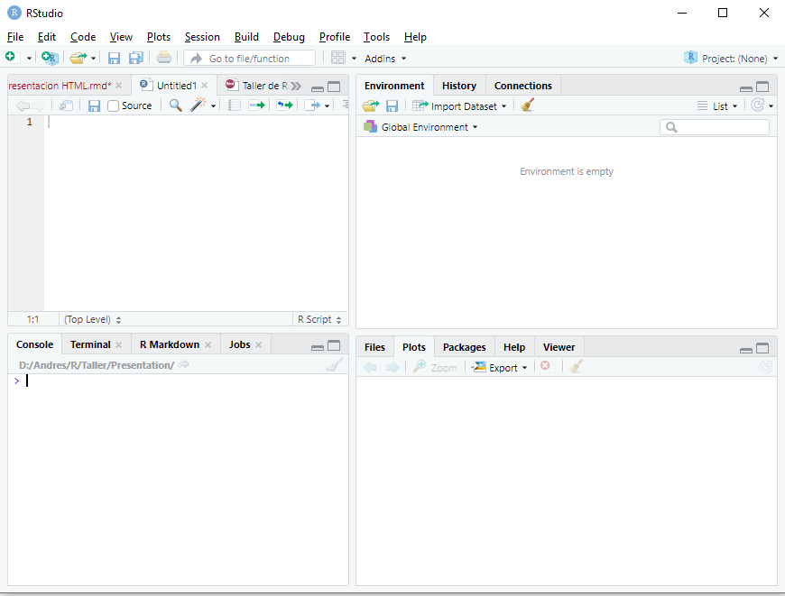 Ventana 1 - Script de trabajo: arriba a la izquierda. En ella abriremos y editaremos nuestros scripts de trabajo. A medida que se escriben las líneas para ejecutarlas debemos posicionarnos en ella (o seleccionarla) y correrlas (Run, arriba a la derecha, o más fácil Ctrl + r).