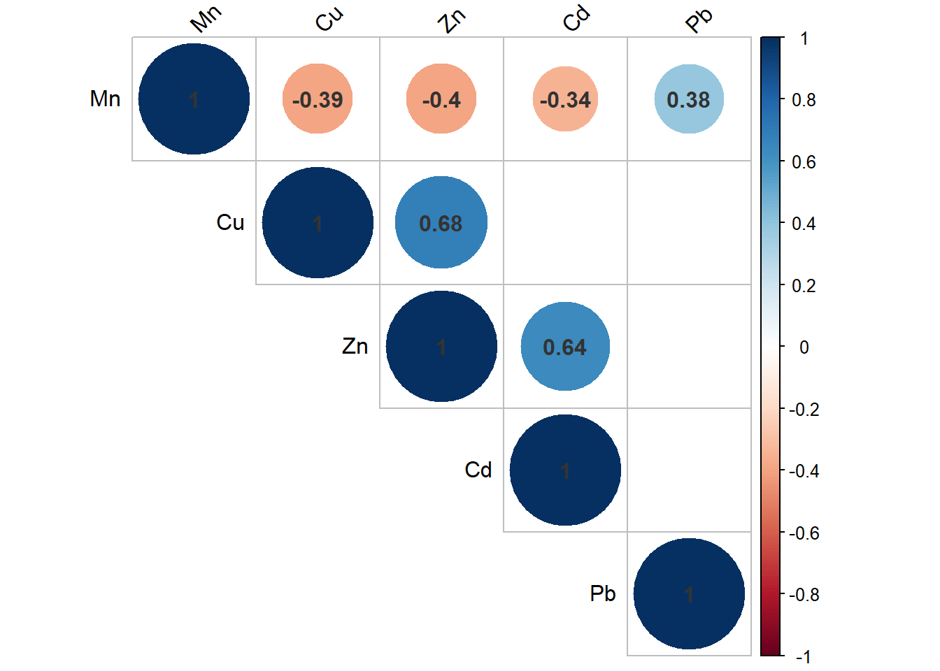 CORR <- cor(SEM[, c("Pb", "Cd", "Mn", "Cu", "Zn")],