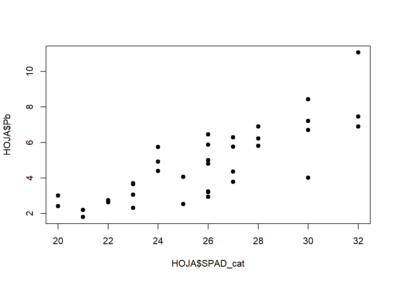 plot(HOJA$SPAD_cat, HOJA$Pb, pch=19)