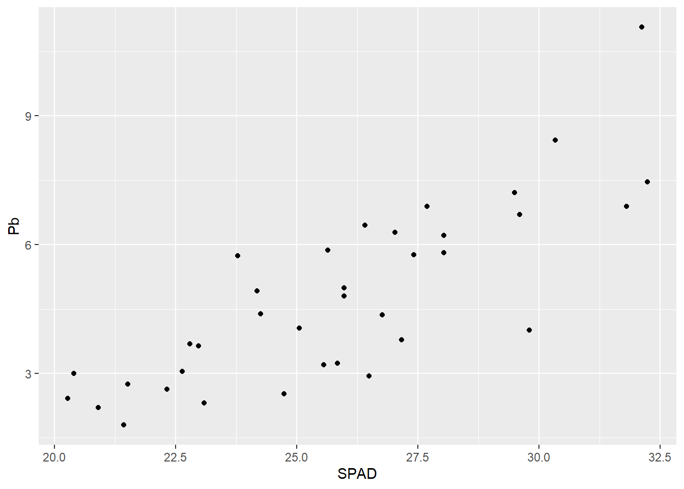 aes(x = SPAD, y = Pb)) + # x e y dentro de aes