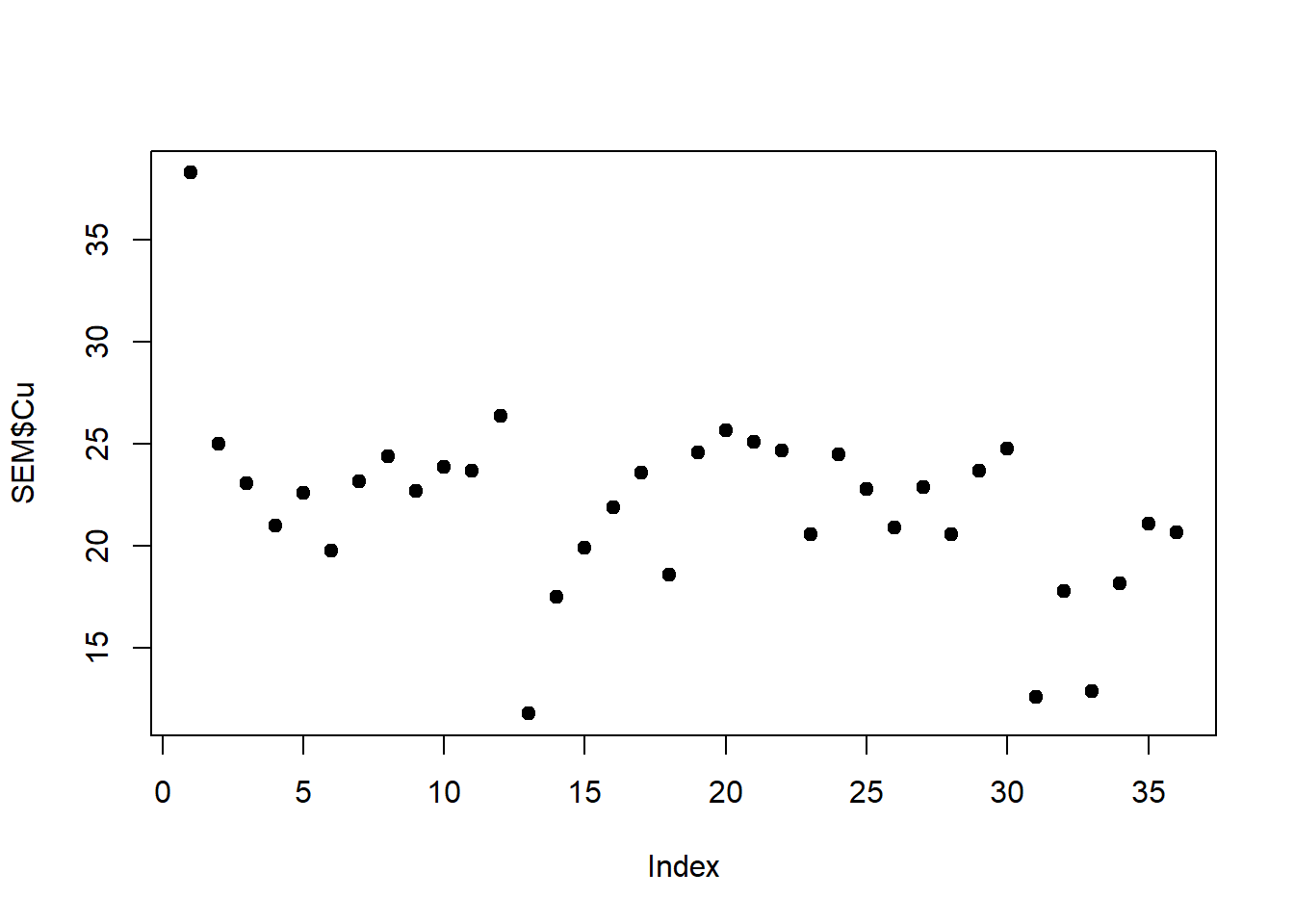 identify(SEM$Cu)Ahora veremos cómo hacer la correlación de pearson, de momento ignorando los supuestos: