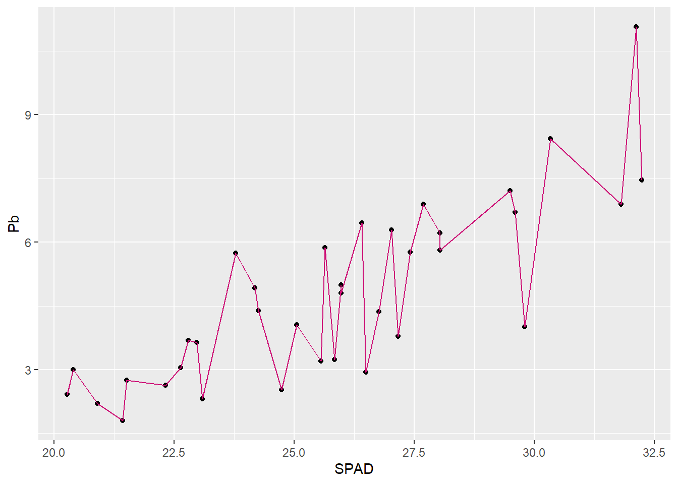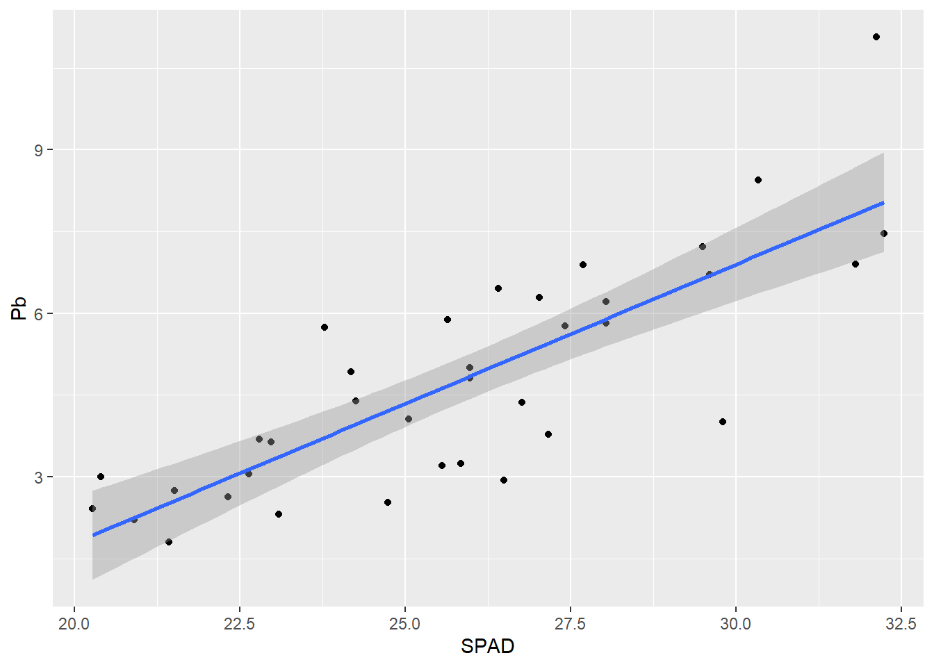 ggplot(HOJA, aes(SPAD, Pb)) +
