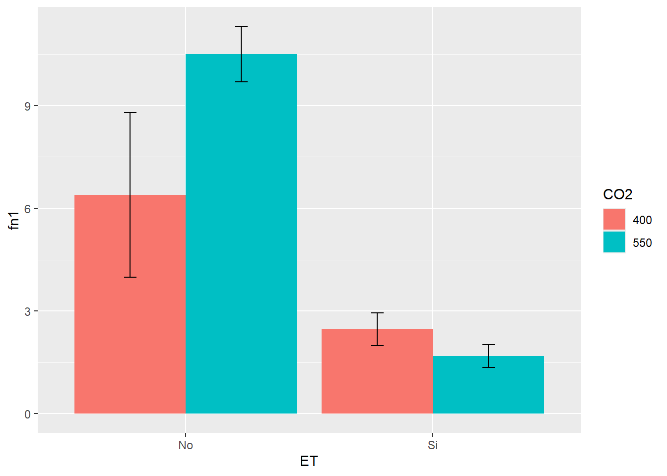Vemos que incorpora las columnas fn1 (que tiene los valores de las medias) y fn2 (con los errores estándares). A estos comandos creados se les anexa el gráfico: